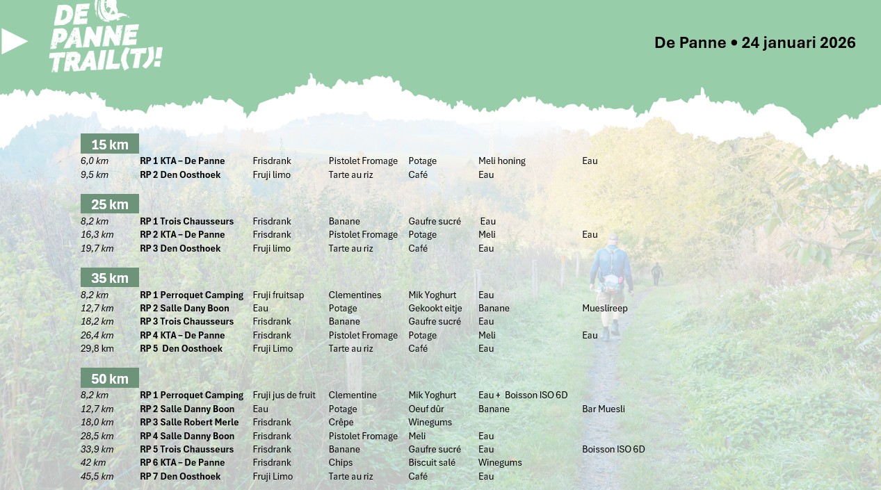Le pack participant comprend un ravitaillement copieux. Nous proposons une grande variété de produits, tels que des fruits, des biscuits, des barres énergétiques, des sandwichs, de la soupe, de l'eau, des boissons sucrées, des gaufres au miel et, pour chaque participant ayant terminé la course, une bière régionale fraîche ou une boisson non alcoolisée.